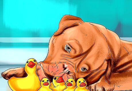 Provide toys while you’re away. It can be difficult to leave your older dog at home. This may upset your dog. Having toys suitable for older dogs can divert its attention until you get home. Some toys that may relax your older dog include: Soft rubber toys for chewing and carrying around “Busy box” toys with hiding places for snacks Balls Soft and/or plush toys without stuffing Dirty laundry that smells like you