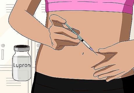 Get relief with a gonadotropin-releasing hormone (Gn-RH) agonist. These medications limit your body’s production of the hormones progesterone and estrogen. This will temporarily stop your period, which allows your fibroids to shrink. You'll also experience less cramping. Since you won't be having your period, your body can also recover from anemia caused by heavy periods. Take your medication as directed. Gn-RH agonists are the best medication for shrinking fibroids. However, you do have other options for managing your symptoms. If your doctor prescribes a Gn-RH agonist like Lupron or Synarel, you can take it for as long as 3 to 6 months. You may experience side effects like severe hot flashes while you’re taking this medication. If they're used long-term, these medicines can cause bone loss. Your doctor can help you decide if this treatment is the best option for you.