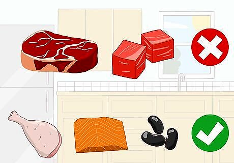 Limit your consumption of red meats. Red meats contain a lot of dietary cholesterol, which can cause your fibroids to grow faster. Replace red meat in your diet with fish, lean meats like chicken or turkey, or plant-based proteins like beans or lentils. Beans and lentils are a great option because they also include antioxidants that reduce inflammation, as well as fiber.