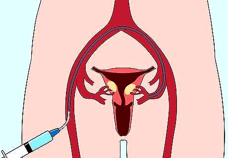 Get a uterine artery embolization injection to shrink your fibroids. If your fibroids don't respond to other non-invasive treatments, you doctor may recommend blocking off their blood supply. Your doctor will inject you near your uterus with tiny particles that are called embolic agents. These particles will flow into your fibroid, blocking off its blood supply and causing it to shrink. This treatment can result in complications, especially if the particles block your blood flow to your ovaries or organs. This treatment usually causes minor discomfort but shouldn’t be painful.