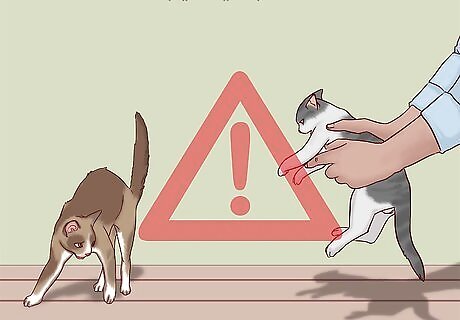 Back away and stay quiet when a cat hisses or spits. When a cat is threatened, they will pull back their gums to show their teeth and make a hissing noise. If you see this occur or feel the cat begin to spray saliva, remove yourself from the immediate area, preferably out of the cat’s sight. Often, the cat will stay where they are and gradually calm down. Never try to pick up or touch a hissing cat. They can bite and scratch you, which can cause serious injuries.