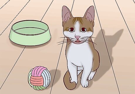Play with the cat when they crouch with their ears forward. When a cat is feeling playful and excitable, they will crouch on their front legs and flick their tail. Use toys, a string, or a feature to lure the cat into pouncing, running, or pawing to play. Keep playing until the cat walks away or begins to use their claws. Keep in mind that when a kitten is learning how to play, they will often bite and scratch to see what they can get away with, since they don't know what will hurt you.Tip: If the cat is being too rough while you’re playing, mimic the sounds of a hurt cat by loudly yowling or wailing. This will signal to the cat that it’s hurting you and that it needs to be more gentle. If it continues to be rough, walk away from the cat to signal the end of play time.