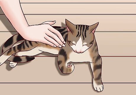 Pet the cat when they're lying down with their tail still and ears pointed forward. Observe your cat by looking at their posture as they lie on their belly or side. If the eyes are partially closed and the cat is still, run your hand along the top of their head and back. If the cat stays in one place, try petting their sides, face, and tail to see how they respond. If the cat shrinks away from your touch or gets up, stop petting them. They may be trying to take a nap!