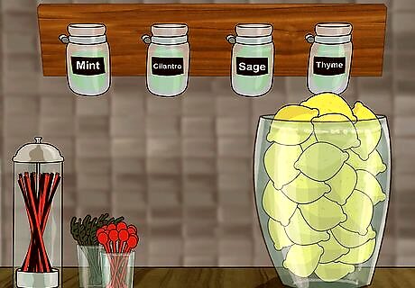 Make room for accents and garnish. You won't need these items for every cocktail you make, but it's standard to provide fresh lemon and lime wedges with drinks. Cocktail cherries, olives and/or onions and simple syrup should be in any well-stocked bar cart. Keep a small, preferably covered bin or section in your cart set aside for these items. Don't forget about cocktail sticks, which are essential for holding garnishes. Some people like to have them just for decoration. Straws and swivel sticks are also good to have in your bar cart. Keep extra limes and lemons to use for juicing.