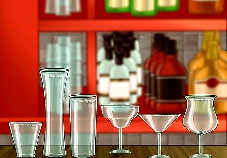 Invest in four to five basic types of glassware. Glassware can get really elaborate and fancy, but a well-stocked bar cart should have a variety of short glasses and a variety of tall glasses. Short glasses include shot glasses and lowballs. The essential taller glasses are pint glasses, highballs and martini glasses. Six to eight of each is ideal for a basic set up. If you're serving wine, you'll need to have wine glasses on hand. At a minimum, you should have one type that will hold any wine you plan to serve. However, most bartenders believe reds and whites should have different glasses. That choice is up to you. If you're only serving beer, only having pint glasses and highballs is fine.