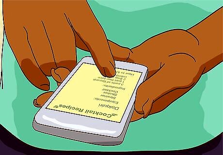 Keep a book or list of your favorite cocktail recipes handy. A basic book of cocktail recipes is good to have on hand no matter what. Of course, these days you can just keep one stored digitally in your smartphone, but traditionally every bar set up includes one of these books. Home bar setups often have personalized recipe books, sometimes even leather-bound and monogrammed. If you're having a party, whip up a few signature cocktails for the event and keep the recipes listed nearby, just in case you need a reference point.