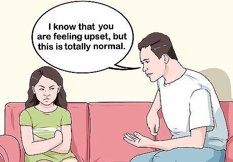 Discuss feelings with your child. As your child grows, they will experience a range of changing feelings. Some stages, like being a toddler or teenager, will bring extreme changes to your child's emotions. If your child is young, talk to them about the different feelings that they may experience. As your child becomes familiar with their emotions, ask them to identify how they are feeling to help them practice processing their emotions. Helping your child to understand their feelings will help them express them in a healthy way. You can find flashcards and story books to help your child better understand feelings. You could say something like, “I know that you are feeling upset, but this is totally normal. Everyone gets frustrated sometimes.”