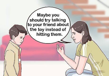 Offer constructive criticism. When you are discussing behaviors with your child, make a point to be constructive. Praise them for good behavior, and redirect them when they act aggressively. When you give them constructive criticism, point out ways that they could handle a situation more effectively, but avoid telling them that they are bad. That way, they understand that their behavior might not be acceptable, but you still love them. For example, you can say something like, “I know you are upset, but I think you could have handled the situation better. Maybe you should try talking to your friend about the toy instead of hitting them.” Make a point to regularly praise your child for good behavior so that they are more open to you when you have to offer constructive criticism.