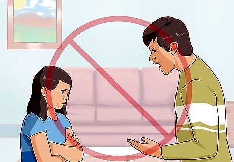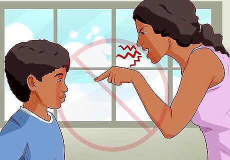 Avoid escalation. You might have the urge to try to frighten aggressive behavior out of your child. While many people do subscribe to this type of parenting, it generally makes the situation worse. When you talk to your child, sit down or get at eye level. Keep a calm voice.. Also, make sure that any physical contact is used as a way to connect empathetically to your child and not as a punishment. If you yell at, or hit, your child when they have upset you, you will be reinforcing aggression as a way to handle emotions.