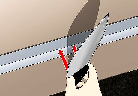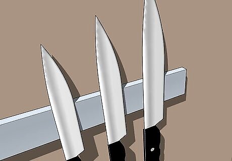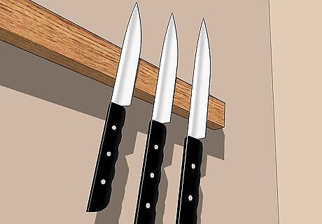 Store your knives on the wall to save counter space. Wall-mounted magnetic strips are a common method of storing kitchen knives. They generally have a strong magnet running along the width whilst surrounded by two slightly raised metal strips running down the center. Not only is this option typically inexpensive to purchase and install, it is easy to access while you are cooking and quick to sanitize when needed. This can be one of the best methods to store your kitchen knives. If placed and removed from the strip properly, minimal contact is made with the sharp edge, which prevents dulling.