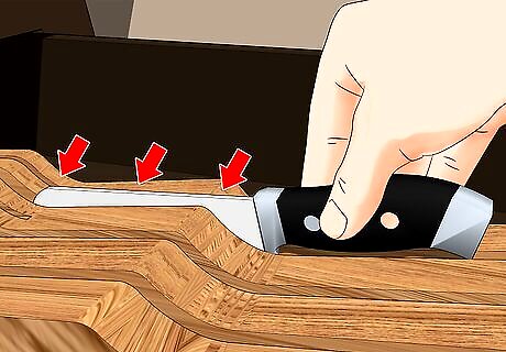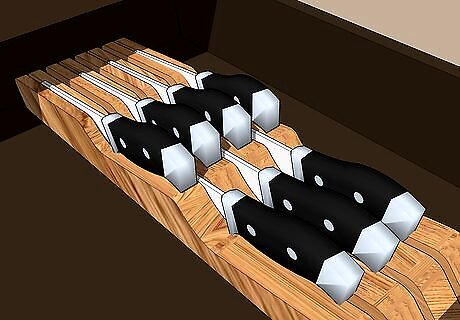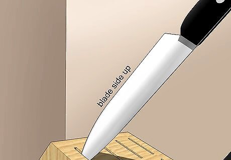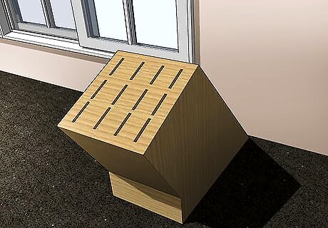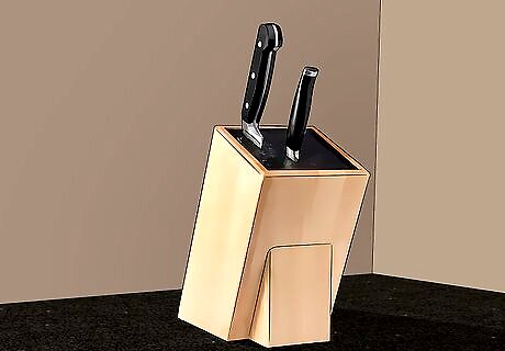 Purchase a countertop knife block for an easy-to-reach option. If you want your blades close at hand and have the counter space to spare, a counter-top knife block is an ideal option for storage. From a standard block that comes with the average knife set to versions with various paint colours and wood stains, there is a knife block to fit the personality of every cook's kitchen.