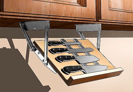 Consider under-cabinet knife storage if a drawer insert doesn't work for you. Sometimes, kitchen drawers don't have ample space to hold additional storage units, so you have to think outside of the box. This can be in the form of a regular knife block simply stored under the counter. You are able to maintain all of the convenience of a counter-top knife block without the easy-access, as it will be stored out of arm's reach. To remedy this as best as possible, try to place the knife block in a cabinet directly under the space you work most frequently. A storage block with a base fixed into place on the cabinet floor, allowing for the block to rotate a full 360°, is a great alternative to an insert. As with a counter-top knife block, if you have oddly shaped knives, opt for a block without pre-sized slots. As well, keep in mind how much additional space your rotating block will need to turn completely, once fully loaded with knives; this is critical to consider in order to prevent the handles of the blade from banging against the walls of the cabinet and scratching unnecessarily.