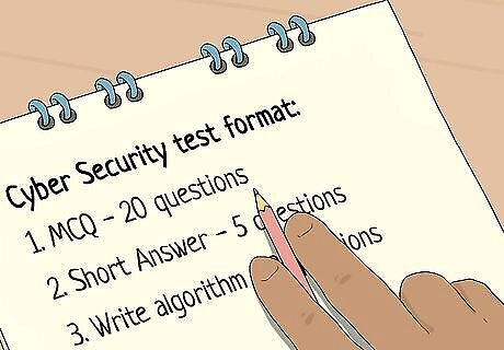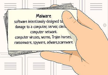 Memorize the key vocabulary so you don't get confused. There are many terms in computer science and security that you'll need to know for almost any test. Usually, your textbook introduces these keywords at the start of the book or chapter beginnings. Review and memorize these terms so you can effectively understand what test questions are asking you. The specific words will depend on the class and topic you're studying, but some important terms are malware, spyware, network map, firewall, breach, worm, Trojan horse, and phishing. If you're rusty on vocabulary, try checking the first few chapters of your textbook and seeing the terms that were introduced early on. These are probably important for the rest of the semester. Flashcards are very helpful for working on vocabulary. Write the words on the front and definitions on the back, then quiz yourself whenever you have free time.