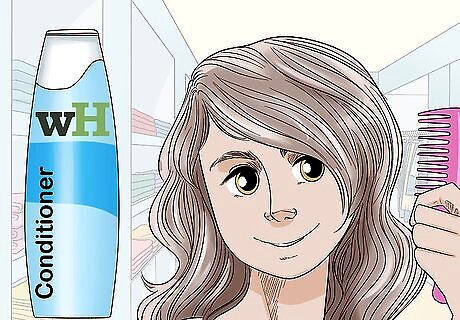 Run a wide-toothed comb through your hair after using conditioner. Once you’re out of the shower, it’s best to avoid combing or brushing your hair, since this can encourage frizz and cause breakage. Apply your conditioner in the shower like you normally would, then comb through your hair. Give it a few minutes to penetrate your hair, then rinse the conditioner out. If you're using a leave-in conditioner, don't rinse it out with water.