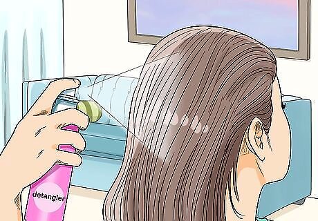 Spray a fast-acting detangler on damp hair. If you have long or curly hair, tangling might be an issue when your hair is damp. Since you want to avoid combing or brushing at this stage, use a detangler product instead. Use a fast-acting, leave-in formula for an extra dose of hydration. Simply spray it on your hair and let it penetrate, then finger comb your hair to remove knots. If you absolutely have to comb through it, be gentle and use a wide-toothed comb.