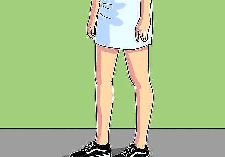 Throw on a skirt for a casual, cooler look. Almost any knee-length skirt will match excellently with a pair of classic Old Skool Vans. Choose something bright, vibrant, or patterned to match the color of your shoes. Alternately, keep your skirt more muted if you want your shirt or accessories to take center stage. As everything goes with black and white Vans, choose a skirt that fits well, is comfortable to wear, and that you like the look of. It’s very difficult to go wrong! If you want a more masculine look, try a pair of shorts instead of a skirt. Making socks look good with a skirt or pair of shorts can be very difficult to do. Try wear low-cut socks that won’t draw too much attention, or even try wearing your Vans without socks at all.