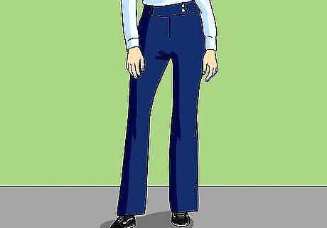 Add a blazer or coat to keep your outfit classy. Wear a full suit by matching a blazer to your pants if you want to look as formal as possible. For something a little less formal, try contrasting a light gray or blue blazer with your darker pants. Alternately, wear a dark trenchcoat or winter jacket to stay warm yet formal. Make sure that your blazer is fitted properly. A poorly fitted blazer will normally look less formal than not wearing a blazer at all. To take your look to another level, wear a waistcoat to make a full 3-piece suit. Stick to fleece or woolen trench coats rather than thinner rain jacket type coats.