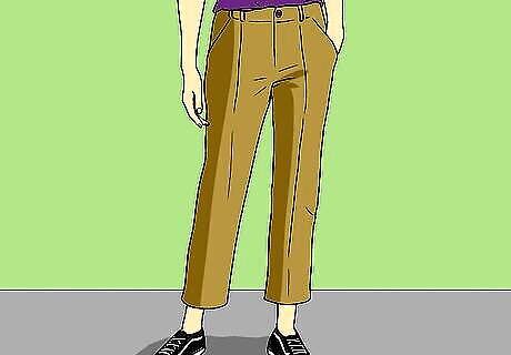 Try some chinos for a slightly more formal look. Chinos are similar to jeans in the way that you can dress them up or down by changing the rest of your outfit. For something a little more formal, wear some darker, dressier chinos with some dark Vans. If you want a more casual look, pick some chinos in a brighter color that go well with your Old Skools. Avoid cuffing your pants when aiming for a formal look. Your shoes should be a part of the outfit, rather than something you’re showing off.