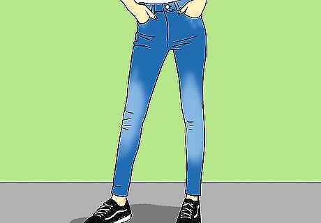 Wear a pair of jeans for a casual yet classic look. Jeans are a great and comfortable starter for almost any casual outfit. Throw on a pair of dark jeans with some black and white Vans to start off a skater look, or try some classic blue jeans for a more retro look. Find some jeans that fit you well and that you find comfortable. Your pants do not need to be a focal point of the outfit. Keep them simple, so you can draw attention to the Old Skools and your shirt. Try cuffing your jeans to show off your shoes a little more and keep them as the main part of your style. If you’re wearing shoes in a brighter color, you may need to match them with a different color of jeans. Paler shoes can be matched well with beige or gray pants. Shoes in a vibrant color will look good with jeans that are slightly darker in color. If you want a more feminine look, try wearing a light blue denim skirt instead.