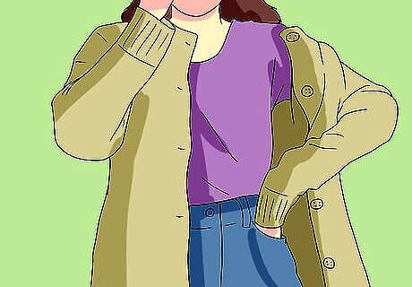 Wear a cardigan or leather jacket to for a retro-casual style. If you want to keep your style a little more casual, add a leather jacket or a coat in a neutral color to complement your t-shirt. For something a little more formal, try a cardigan that’s light gray or beige to add some layers to your look. Rather than matching your shirt to your shoes and adding a more neutral layer over the top, you could keep your shirt neutral and add a brighter cardigan or jacket that matches your shoes for a more vibrant yet classic style.