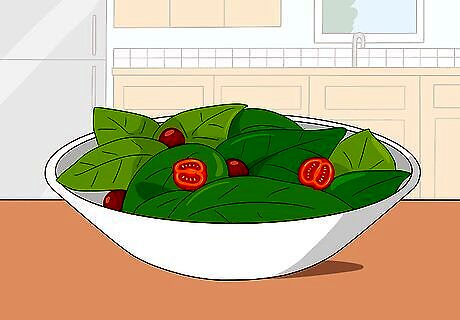 Add a nutritious side-salad to your regular meals. If your diet is low on raw vegetables, try supplementing your meals with a simple side-salad. When you're eating out, order the salad instead of fries or chips. At home, keep spinach, lettuce, and tomatoes in supply. It only takes a minute to throw some vegetables together with dressing. Put a small handful of spinach leaves on your plate, drop 5-6 cherry tomatoes on top, and drip a little olive oil and vinegar on them -- just enough to wet the leaves. Mix honey, olive oil, apple cider vinegar, salt, and pepper together, and pour it over lettuce and apple slices. If desired, add slivers of fennel.