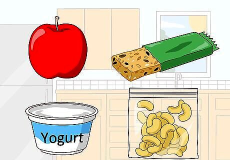 Opt for nutritious snacks instead of empty calories. Make snacking a healthy part of your diet. Keep fresh apples, pears, carrots, tomatoes, snap peas, berries, and yogurt in your kitchen. Eat small portions of nuts and seeds. If you often get hungry in the car, stash some granola bars in it to snack on the go. Carry plastic bags of nuts in your purse, backpack, or briefcase.