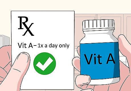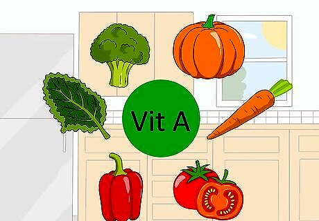 Eat orange, red, and green veggies for vitamin A. Vitamin A comes in 2 forms, preformed and proto-vitamin, both of which are good for your vision and immune system. Sweet potatoes, pumpkin, carrots, cantaloupe, and tomatoes all give you vitamin A. Leafy greens, meat, and dairy do as well. Animal products will provide you with more preformed vitamin A, while vegetables contain more provitamin A. Aim for about 700 mcg, and don't exceed 3,000 mcg.