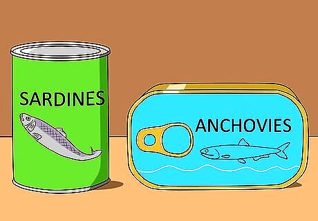 Use oily fish as a kitchen staple. Oily fish are a vital component of your diet, as they contain protein, omega-3 fatty acids, calcium, vitamin D, and vitamin B-12. However, you likely don't eat enough oily fish. To remedy this, keep canned sardines and anchovies in the kitchen. Anchovies add an umami flavor to everything from sauce, soup to salad dressing. Throw them in the pan while you're cooking meat, vegetables, or tofu—they'll melt away to pure flavor. Sardines add a mild, rich layer of texture and flavor to sandwiches, sauces, and composed salads.