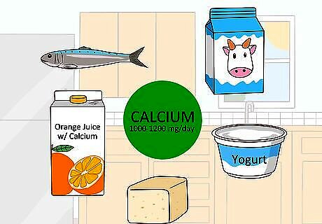 Consume daily dairy or tofu for calcium. Drink milk, eat yogurt, and enjoy other dairy products as a part of your ordinary day. If you don't eat dairy, tofu and tofu products are also calcium-rich and dairy-free. Sardines are an excellent source of calcium. Calcium-fortified products, like fortified orange juice, can also take care of your calcium needs. Aim for 1,000–1,200 mg of calcium a day, and don't exceed 2,000 mg.