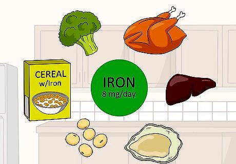Make sure you are eating plenty of iron, especially if you are a vegetarian. Meat such as turkey, chicken liver, and oysters contain the iron you need. For vegetarian options, legumes (especially soybeans) and iron-enriched cereal are advisable. If you're a vegetarian, you will have to be more careful about absorbing iron, as your body stores less of the iron in plants. Eat iron-rich vegetables alongside foods rich in vitamin C. Get 8 mg a day of iron, and don't ingest more than 45 mg.