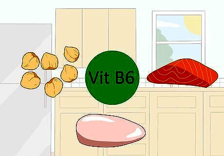 Find your vitamin B6 in protein. Eating salmon or chicken breast will provide you with vitamin B6. Chickpeas are a delicious source of vitamin B6, and can be eaten as beans or ground up into a tasty hummus. Aim to get about 1.5 mg a day, and don't go over 3000 mg.