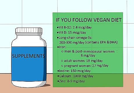 Consider taking supplements if you follow a vegan diet. Meat and dairy are straightforward sources of many important nutrients. While some vegans have access to a wide range of nutritious plant-based alternatives, others do not. If you can't get enough fresh produce and fortified food in your life, consider supplementing with the following: Vitamin B-12 Vitamin D Long-chain omega-3s - eicosapentaenoic acid (EPA) and docosahexaenoic acid (DHA) Iron Iodine Calcium Zinc