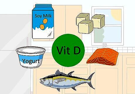 Eat dairy and fish for vitamin D. Salmon and tuna are good sources. Yogurt is a great source, and a good way to start your day. Buy milk, soy milk, or tofu that has been fortified with vitamin D. Mushrooms are a great source of vitamin D, especially if you let them sit in the sunlight for 20 minutes before cooking them. Of course, you can also get vitamin D from exposure to sunlight—and you should! Don't take in more than 4,100 IU of artificial vitamin D supplements.