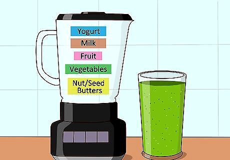 Blend produce and supplements into a smoothie. If you don’t have time to eat a lot of fresh fruits and vegetables, or if you just want a refreshing treat that's good for you, blend up a smoothie. You can make any smoothie with 1 part liquids and 4 parts produce. A delicious breakfast smoothie might contain yogurt, milk, fruit, vegetables, and nut/seed butters. Add ground flax seed, turmeric, ginger, spirulina, or other nutritional supplements to your smoothie. Try blending ⁄2 cup (120 mL) of yogurt and almond milk, 2 cups (470 mL) of avocado and spinach, 1 tablespoon (15 mL) of maple syrup, 1 tablespoon (15 mL) of almond butter, and ⁄2 cup (120 mL) of ice for a filling and delicious smoothie. 1 cup (240 mL) of frozen blueberries, a banana, ⁄2 cup (120 mL) of milk, and ⁄2 cup (120 mL) of peanut butter with 1 tablespoon (6.6 g) of flaxseed is another great combination. You can make smoothies fresh for maximum nutrients, but if you're in a rush you can buy pre-made smoothies at many convenience and grocery stories.