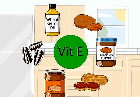 Include nuts and seeds in your diet for vitamin E. Almonds and almond butter, peanuts and peanut butter, and sunflower seeds are all great sources of vitamin E. Wheat germ oil can be slipped into many recipes and is rich in vitamin E. Go for about 15 mg of vitamin E, and do not exceed 1000 mg.