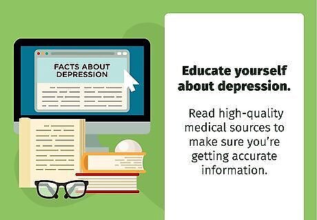 Educate yourself about depression. If someone in your life suffers from depression, then learning about the condition is a good start. This way, you can spot symptoms of depression and learn about the most effective ways to care for the person. Read high-quality medical sources to make sure you’re getting accurate information. Some good sources are: The National Institute of Mental Health: https://www.nimh.nih.gov/health/topics/depression/index.shtml Mayo Clinic: https://www.mayoclinic.org/diseases-conditions/depression/symptoms-causes/syc-20356007 Help Guide International: https://www.helpguide.org/articles/depression/depression-symptoms-and-warning-signs.htm The World Health Organization: https://www.who.int/health-topics/depression#tab=tab_1