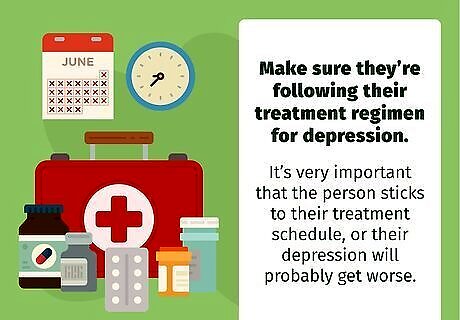 Make sure they’re following their treatment regimen for depression. The therapist will probably give the person a care regimen and medication to manage their depression. It’s very important that the person sticks to their treatment schedule, or their depression will probably get worse. Check in and ask how their treatment is going, and remind them that they need to follow the care schedule. If they were being treated for depression before the COVID-19 outbreak, then they probably already had a regimen in place. Encourage them to continue following that regimen while they’re isolated. Unfortunately, you can’t force someone to follow their treatment regimen. You can only watch them and encourage them to do so.