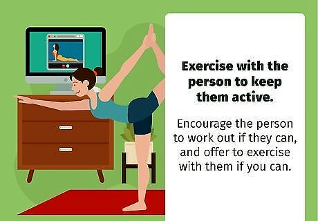 Exercise with the person to keep them active. Being isolated can make it difficult to stay active, but exercise is a known way to improve mental health. Encourage the person to work out if they can, and offer to exercise with them if you can. Even a walk every few days can be a big boost to the person’s mental health. If you don’t live with the person, try doing a video chat with them and exercising that way. You could also send them workout videos to do at home.