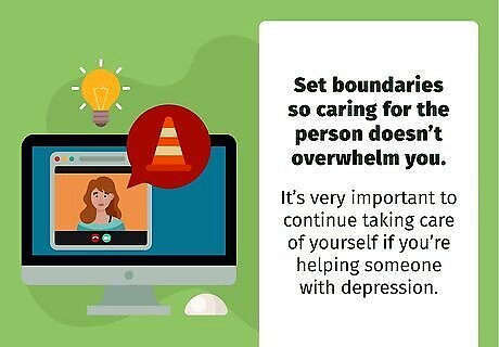 Set boundaries so caring for the person doesn’t overwhelm you. It’s very important to continue taking care of yourself if you’re helping someone with depression. You can’t be expected to provide round-the-clock care, and you’ll burn yourself out if you try. Be honest and tell the person what you’re willing to do for them. On your own time, enjoy hobbies and distractions to support your own mental health. As a general rule, caring for the person shouldn’t interfere with your own life. If it is, then you should consider communicating and setting some boundaries. You might be hesitant to tell a depressed person that they’re crossing a line to avoid upsetting them, but this is counterproductive. You’re not only sacrificing your own mental health, but the person might also notice that you’re silently resenting them and feel worse.