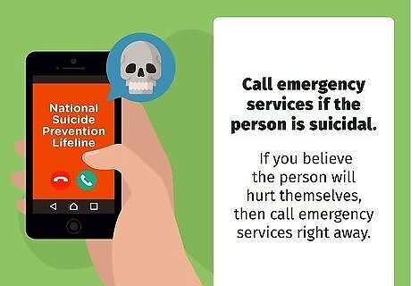 Call emergency services if the person is suicidal. It’s an emergency situation if someone is expressing suicidal thoughts or is threatening suicide. If you believe the person will hurt themselves, then call emergency services right away. Do not leave them alone. Stay with them and monitor them until help arrives. It’s only an emergency situation if the person is actively threatening suicide, but there are other signs of suicidal thoughts that you should watch out for. Saying goodbye, suddenly trying to get all their affairs in order, acting in self-destructive ways, or consistently talking about death are all warning signs. Talk to the person and say you’re worried about them. Call their therapist if you have to. Call the National Suicide Prevention Hotline if you don't know what to do. The number is 1-800-273-8255 and it's available 24/7. For more details, you can visit the website at https://suicidepreventionlifeline.org/. You could also text the Crisis Text Line 24/7 at 741741. If you're in another country, there are also international numbers that you can find at https://www.crisistextline.org/.
