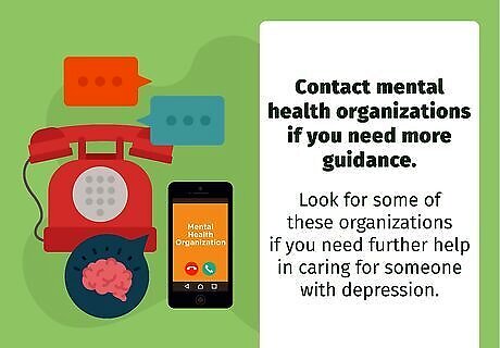 Contact mental health organizations if you need more guidance. Unless you’re a trained therapist, then you’re probably not an expert on depression. Fortunately, there are organizations dedicated to providing information and guidance to patients and caregivers. Look for some of these organizations if you need further help in caring for someone with depression. The National Alliance on Mental Illness provides information and advice for caregivers. Check their website at https://nami.org/Home. There may also be local support groups. Look online for groups in your area, and encourage the person with depression to take part as well. Religious organizations sometimes offer mental health counseling, but make sure the counselors have proper mental health credentials. Being a member of a church, for example, doesn’t automatically qualify someone as a mental health professional.