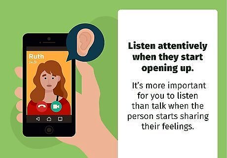 Listen attentively when they start opening up. It’s more important for you to listen than talk when the person starts sharing their feelings. You can ask a few guiding questions like “How long have you been feeling like this?” or “Do you know what’s making you feel worse?” But overall, be a good listener and let them vent. Resist the urge to offer advice unless they ask for it. Depression isn’t the sort of thing that advice cures, and sometimes it could make them feel worse. Pay attention to the way the person is talking. If they hint that they might hurt themselves or don’t want to live anymore, call emergency services or the Suicide Prevention Lifeline (1-800-273-8255) for help.