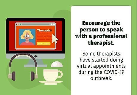 Encourage the person to speak with a professional therapist. Unfortunately, you can’t cure a person’s depression, even if you’re the most supportive friend in the world. It often takes professional counseling and medication to overcome. If the person seems like they’re getting worse and the depression is interfering with their life, then tell them that it’s best to speak with a therapist. Offer to help them find one and make an appointment to encourage them. Be clear that you’re not a trained therapist. While you can be supportive and helpful, you’re not qualified to treat their condition. Some therapists have started doing virtual appointments during the COVID-19 outbreak. This makes scheduling and keeping appointments even more convenient.