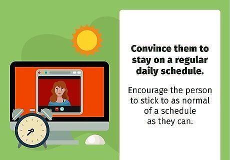 Convince them to stay on a regular daily schedule. With everyone staying home, it’s very easy to lose the schedule and structure you had in place. Depressed people usually don’t respond well when they lose structure, so encourage the person to stick to as normal of a schedule as they can. Waking up at the same time every day, eating meals at regular times, working during normal business hours, and going to bed at the same time all help regain some structure and improve mental health. If they’re not currently working, they can still maintain a schedule. For example, they could spend mornings reading, then clean before lunch, exercise for an hour after lunch, and talk to family in the evenings. If they’re falling out of their routine, offer to help them draw up a daily schedule and encourage them to stick to it.
