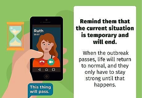 Remind them that the current situation is temporary and will end. It’s easy to feel like the outbreak, quarantining, and isolation will last forever, but it won’t. Tell the person that things are hard now, but it’s all temporary. When the outbreak passes, life will return to normal, and they only have to stay strong until that happens. You could point out that other places were hit by the virus and it passed eventually. They only need to stay isolated temporarily. Avoid putting a timeline on things, though, because there’s no way you can tell how long it will be. If you tell the person that this will be over in a month and it isn’t, then they’ll get more upset. Just assure them that it’s temporary.