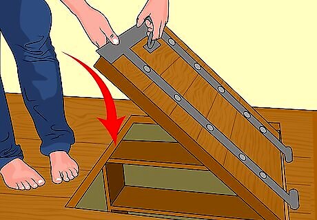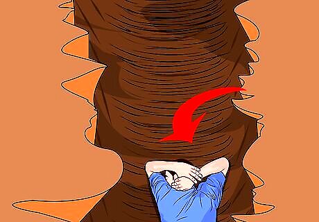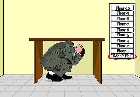 Stay in a windowless room on the lowest level, if you can't go underground. In a building with no basement, avoid windows and go to the lowest floor. Alternatively, seek shelter in a small room that is located near the center of the house, under a stairwell, or in an interior hallway with no windows. Regardless of where you are, crouch low to the ground or lie down, face down and cover your head with your hands and arms. Take cover under a strong table if possible, and cover yourself with a mattress, cushions, or blankets. Bathrooms can be particularly effective because they are fortified by pipes and you can lie in a bathtub. Stay out of elevators, as you could be trapped in them if power is lost. Instead, use the stairs to descend to the lowest floor.