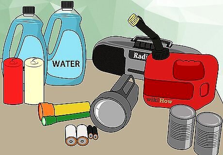 Put together a tornado emergency kit. Stash the kit in your safe room. This should contain all the basics for survival in the worst-case scenario, and can be used as a general emergency kit for most natural disasters. First-Aid Gauze, antibiotic wipes, pain relievers, bandages, broad-spectrum antibiotic, necessary prescriptions, adhesive tape, diarrhea medicine, bar of soap Food and Water 1 gallon (4 liters) for each person in house, canned goods, cracker packs, and other non-perishables General Scissors, writing materials, flashlights, battery-operated radio, extra batteries, pocket knife, plastic bags, needle and thread