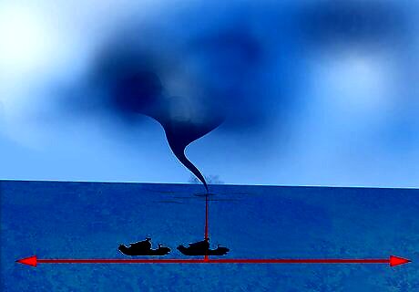 Move perpendicular to the tornado's direction, if you're caught on open water. Waterspouts, tornadoes that form over water, pose a special problem. While they are generally weaker and slower than tornadoes on land, it's not possible to seek shelter on the open water. If waterspouts have been sighted in the area, get out of the water, if possible. If you're in the water when a waterspout hits, experts recommend trying to avoid it by sailing at right angles to its path, not straight away from it. If a waterspout is about to hit the boat, it's probably best to dive overboard, as you then have a better chance of avoiding injury from flying debris. If you are on land and a waterspout is very close to shore, you are not necessarily safe. While they rarely come on land, they can. Treat them like any other tornado and get to cover in case they come on land.