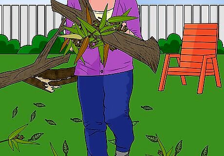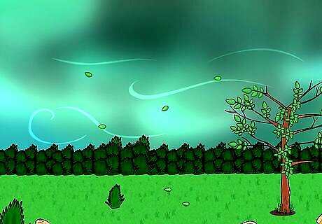 Clean your lawn of potentially dangerous debris. Keeping your lawn clean is about more than looks. Dead branches, decorations, and lawn chairs will be whipped at hundreds of miles an hour in the event of a tornado, which can turn into a serious hazard. To keep your property safe during a tornado, take the following precautions: Cut away dead or damaged tree branches that could be ripped off in high winds. Tie down or secure lawn furniture. If you are unable to, consider moving heavier pieces indoors, but only if you have time. Keep your lawn free of anything that could turn into a weapon when picked up by a tornado, such as glass gazing balls.