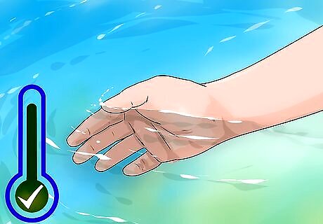 Check the temperature of the water. It is difficult for babies to regulate their body temperature, so be sure to check the water before your baby goes in. Use your best judgment to gauge the water’s temperature. If the water seems quite cold to you, then it will feel very cold to your baby. Take your baby out of the water if they begin to shiver or if their lips turn blue. If your baby is too cold, remove the wet swimming gear and wrap them in a warm, dry blanket or towel.